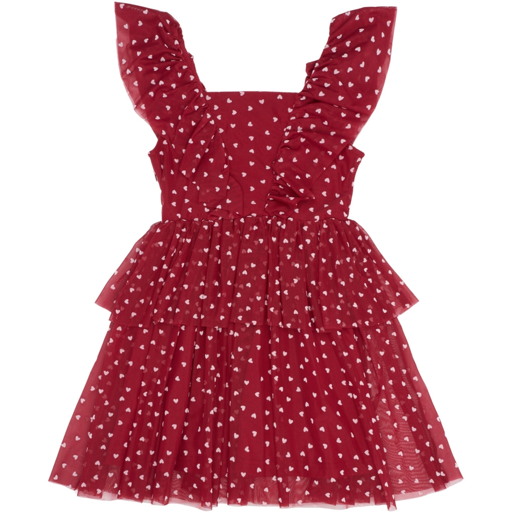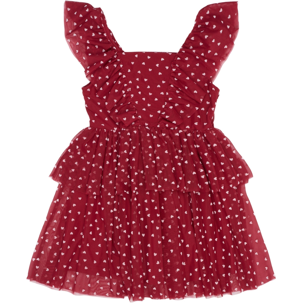 A sweet and romantic dress from THE NEW that exudes elegance and playfulness. The dress features delicate ruffle details at the shoulders and skirt, creating a beautiful, voluminous look. The lightweight mesh fabric is decorated with small hearts. The dress is designed with two layers: a soft and breathable cotton lining on the inside and a sheer, lightweight mesh layer on the outside. It has a practical side zipper for easy dressing, while the elastic waistband ensures a comfortable and flexible fit. Perfect for special occasions that call for a little extra charm.