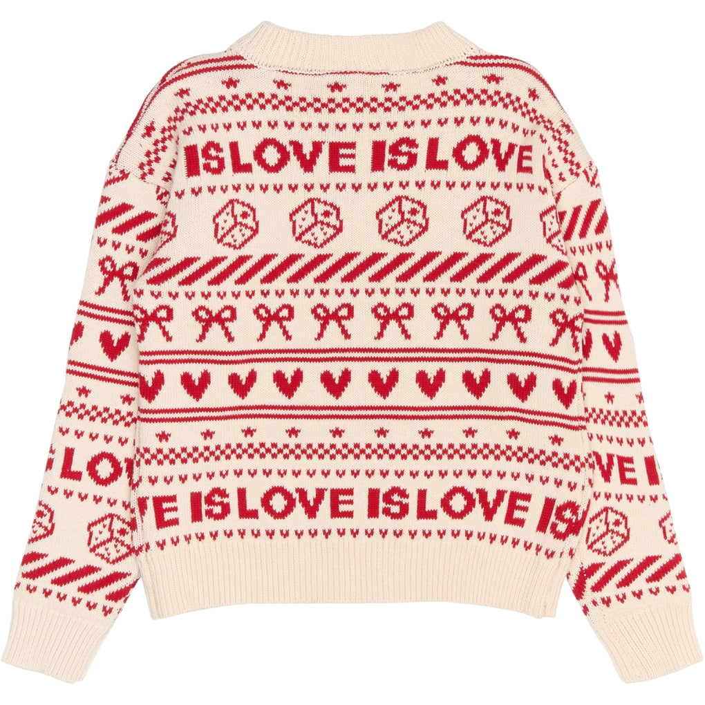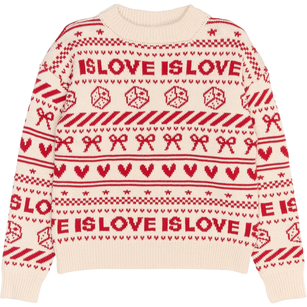 Embrace both warmth and style with this beautiful jacquard pullover from THE NEW. The knit comes in an elegant cream shade and is adorned with unique red details, creating a playful and eye-catching design. Featuring a stunning mix of patterns – dice, bows, stripes, hearts, and checks – along with the inspiring text *"Love is love"*, this pullover combines a cool statement with timeless comfort. The soft quality ensures a cozy fit, while the intricate jacquard knit adds an exclusive touch. Perfect for adding a touch of personality and warmth to your outfit on chilly days.