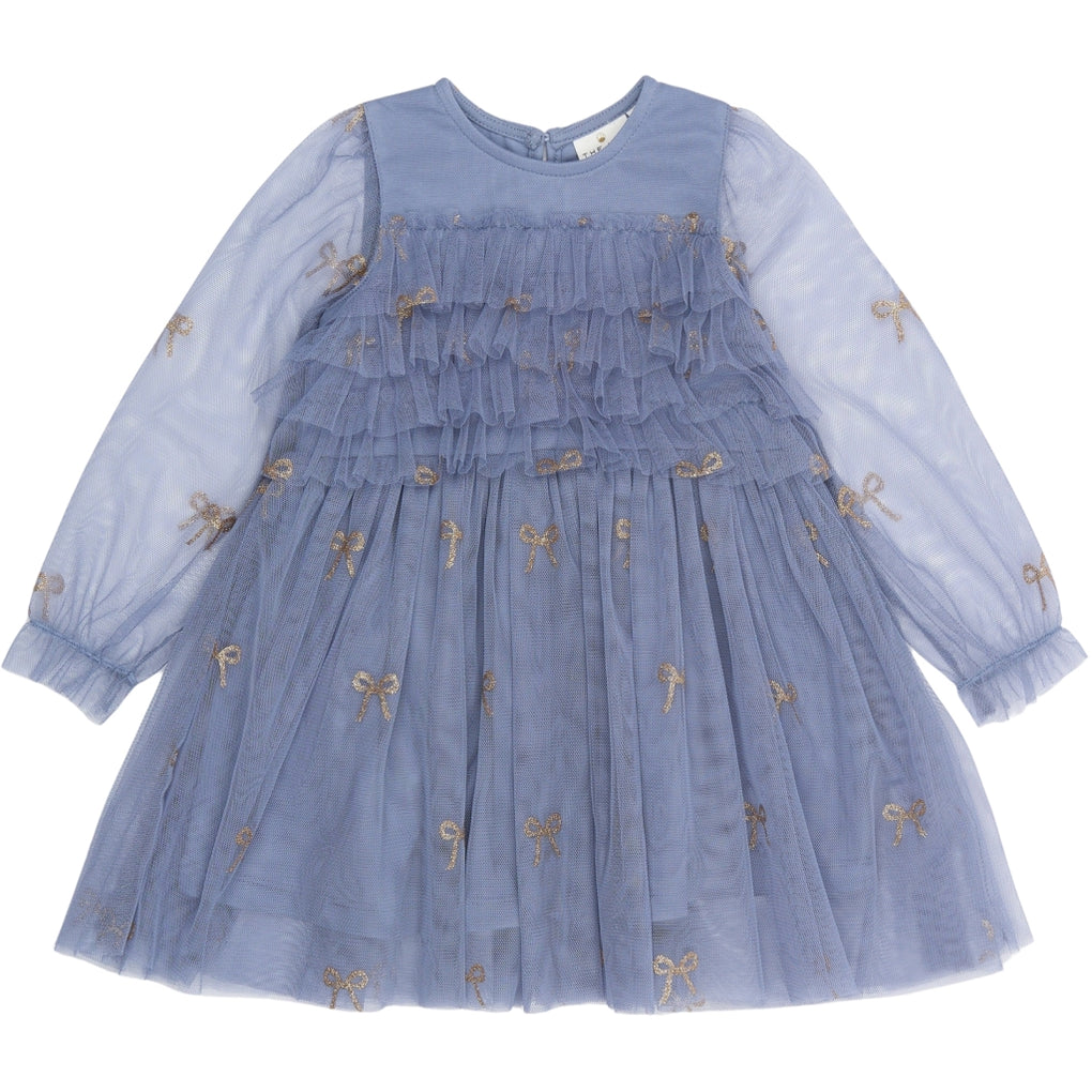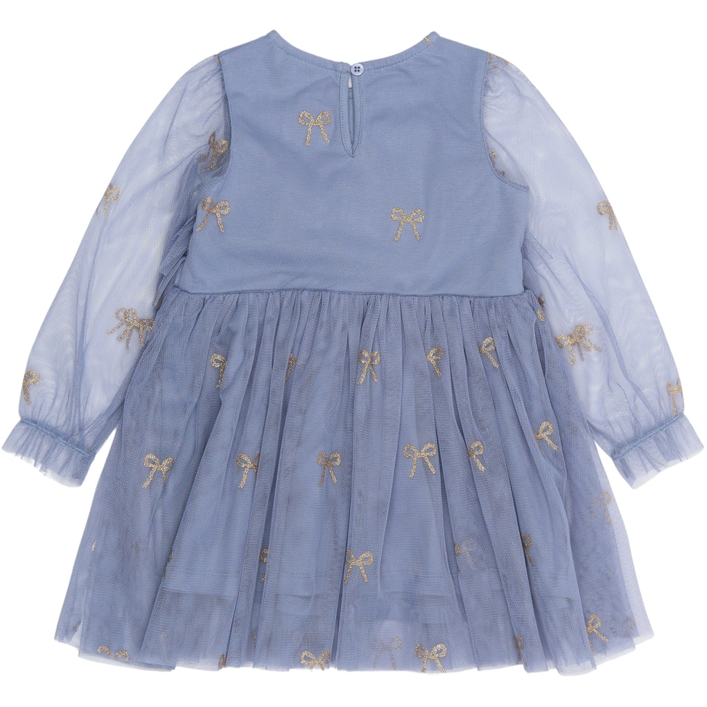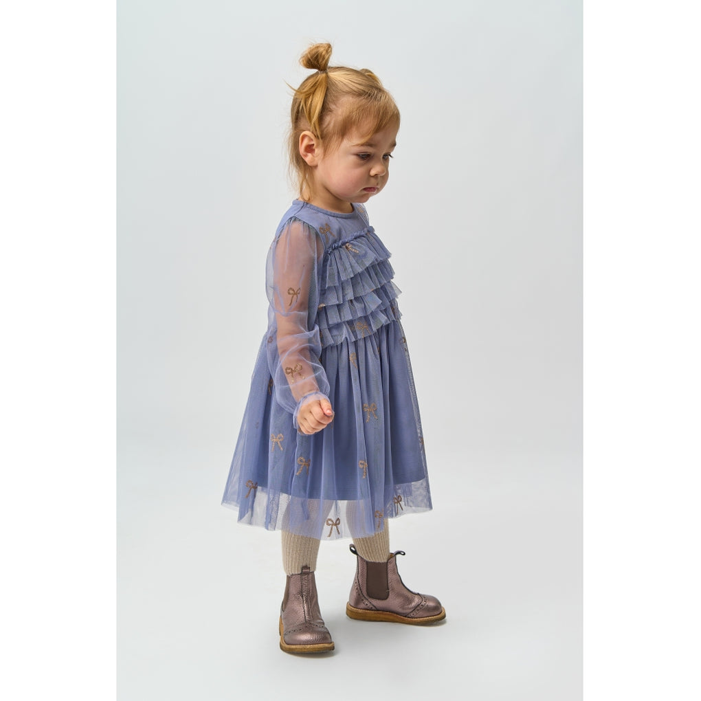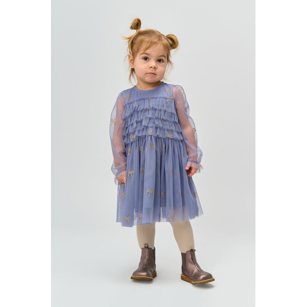 This dress from THE NEW Siblings is a dreamy and elegant style, perfect for festive occasions. Made from layered tulle with beautiful embroidered bows, it offers a delicate and feminine look. The dress features long sheer sleeves, gathered detailing across the chest, and a wide fit that creates a light and airy silhouette. An ideal choice for both special events and dress-up moments.