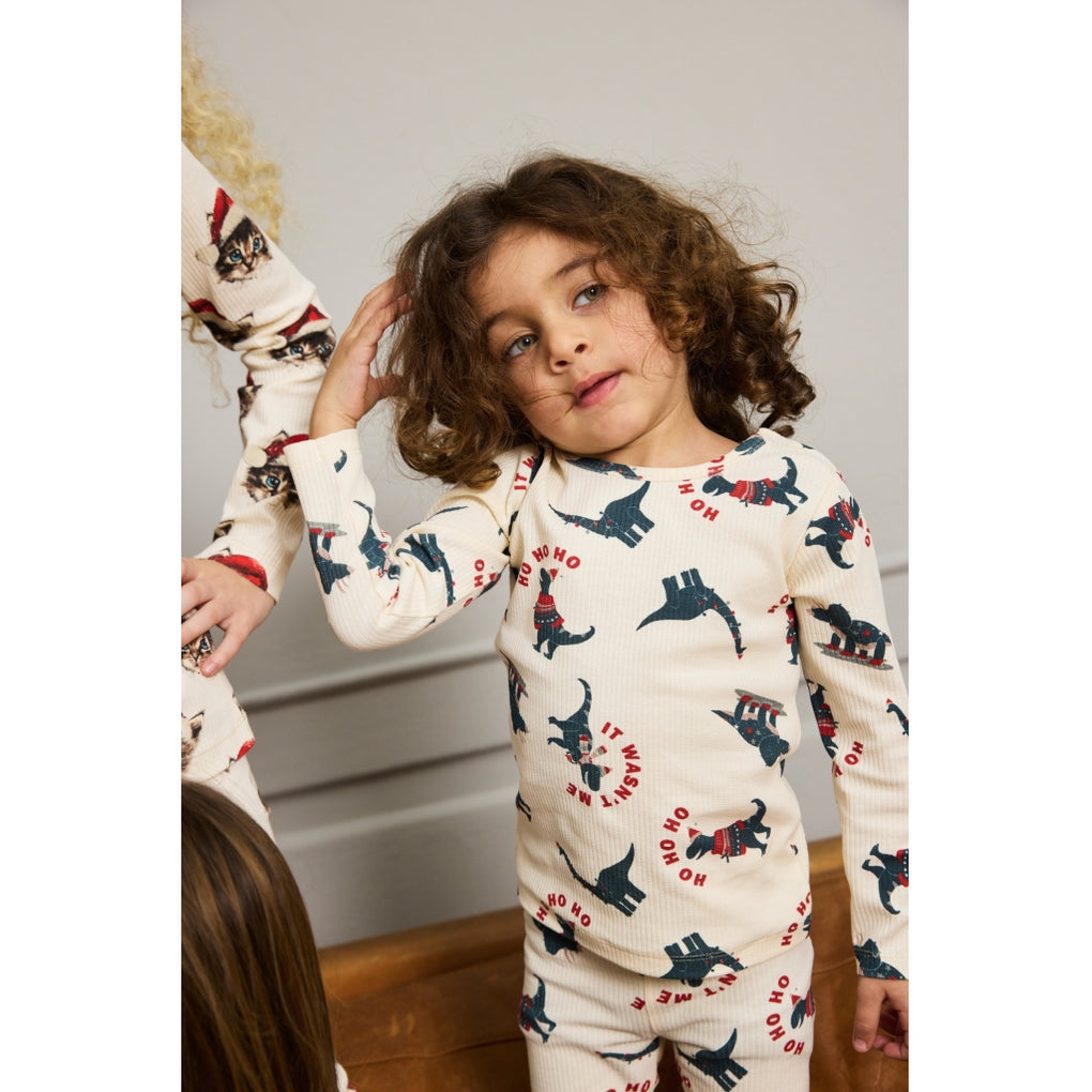 This pajama set from THE NEW Siblings is both cozy and festive – perfect for bedtime during the holiday season. It includes a long-sleeved top and matching pants with a fun all-over print, available in two versions: cats wearing Santa hats or dinosaurs in Christmas outfits. The soft and stretchy ribbed fabric ensures great comfort and freedom of movement all night long.