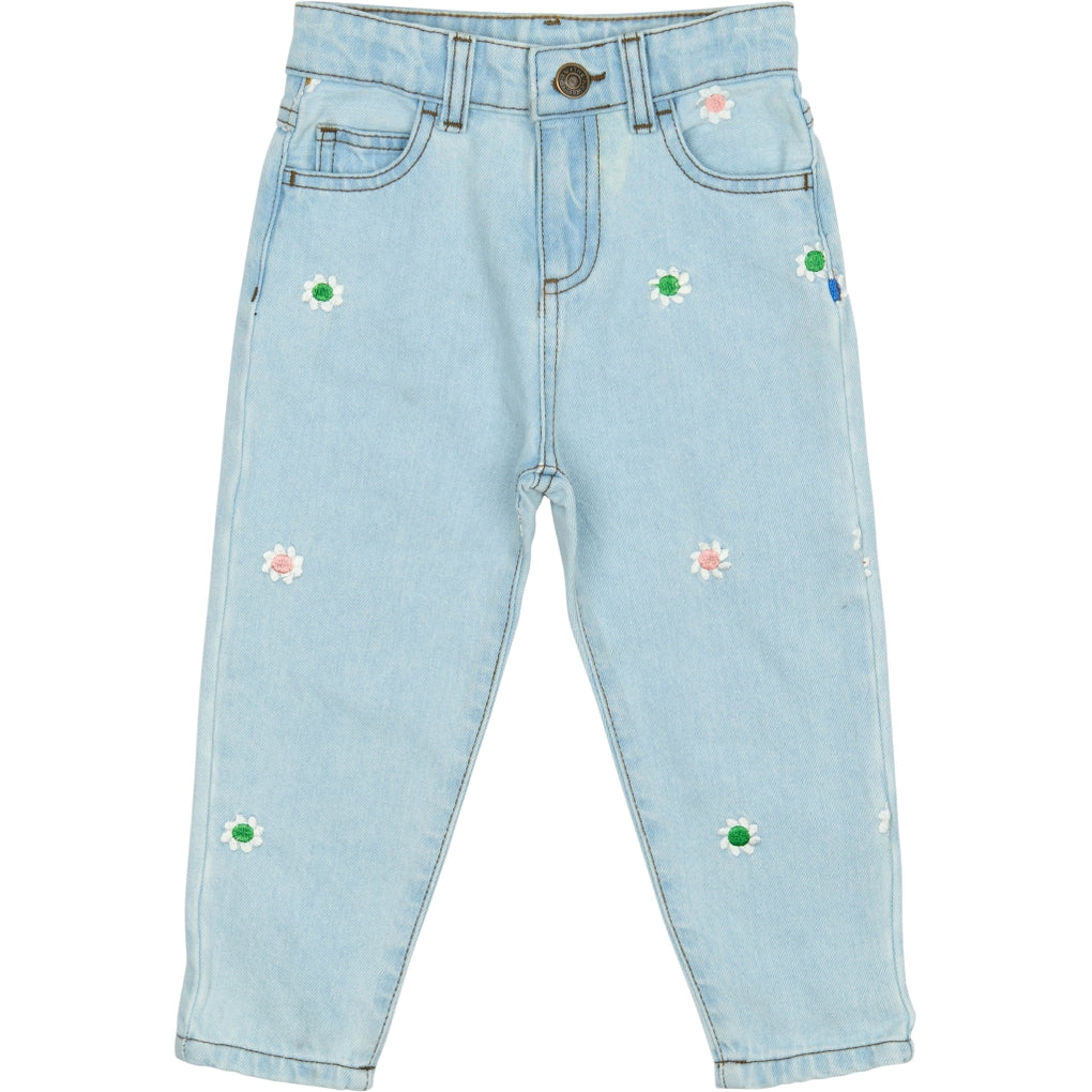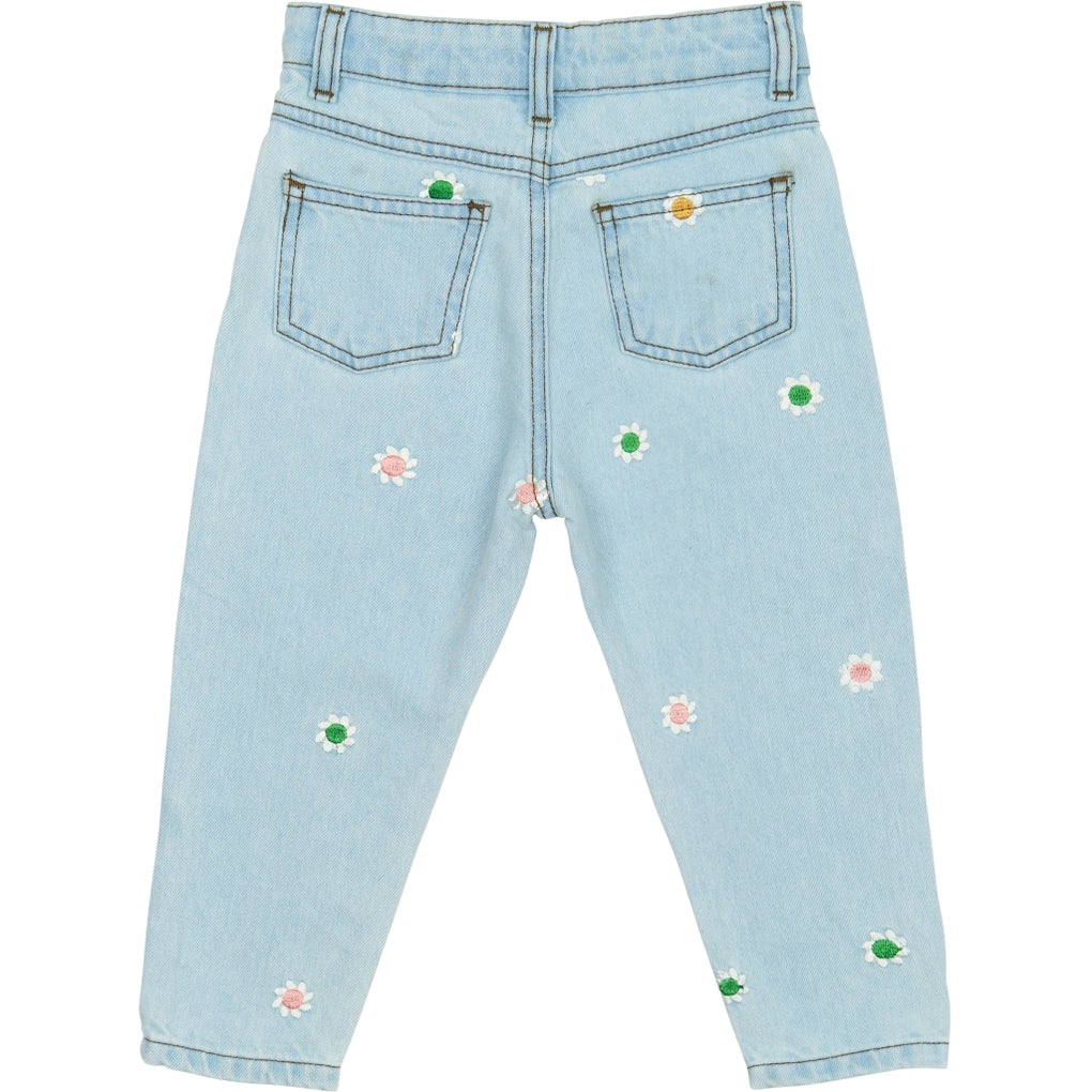 These light blue denim pants from THE NEW siblings are both stylish and comfortable. The pants feature both front and back pockets, a practical button closure, and belt loops. The embroidered flowers add a feminine and unique touch, making them perfect for both everyday wear and special occasions.