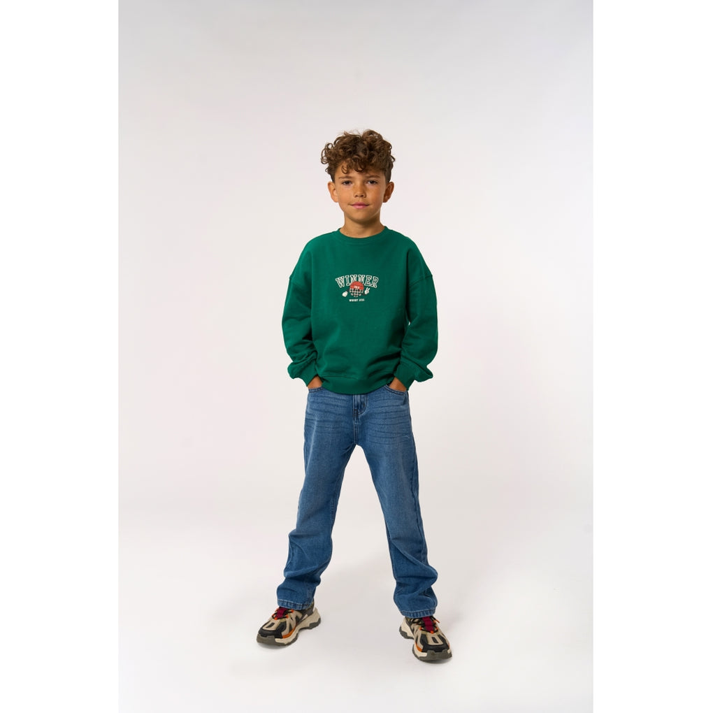 Oversized sweatshirt from THE NEW with a playful and unique design. The front features a chest pocket with a smiley giving a peace sign, wearing a cap with the text "YOLO." Above the pocket is the text "Winner." The back features an enlarged version of the smiley print along with the phrase "worry less," adding a relaxed and positive vibe. Perfect for everyday wear and fun occasions.