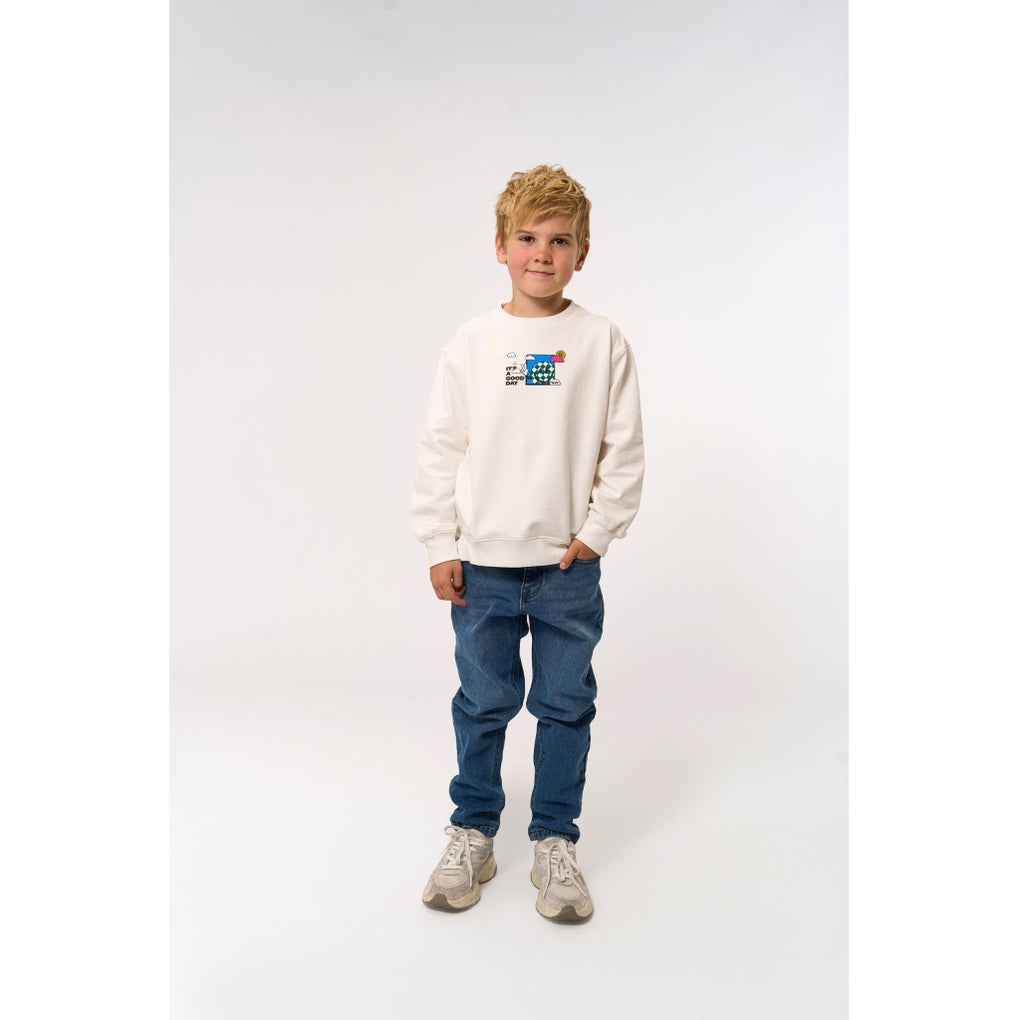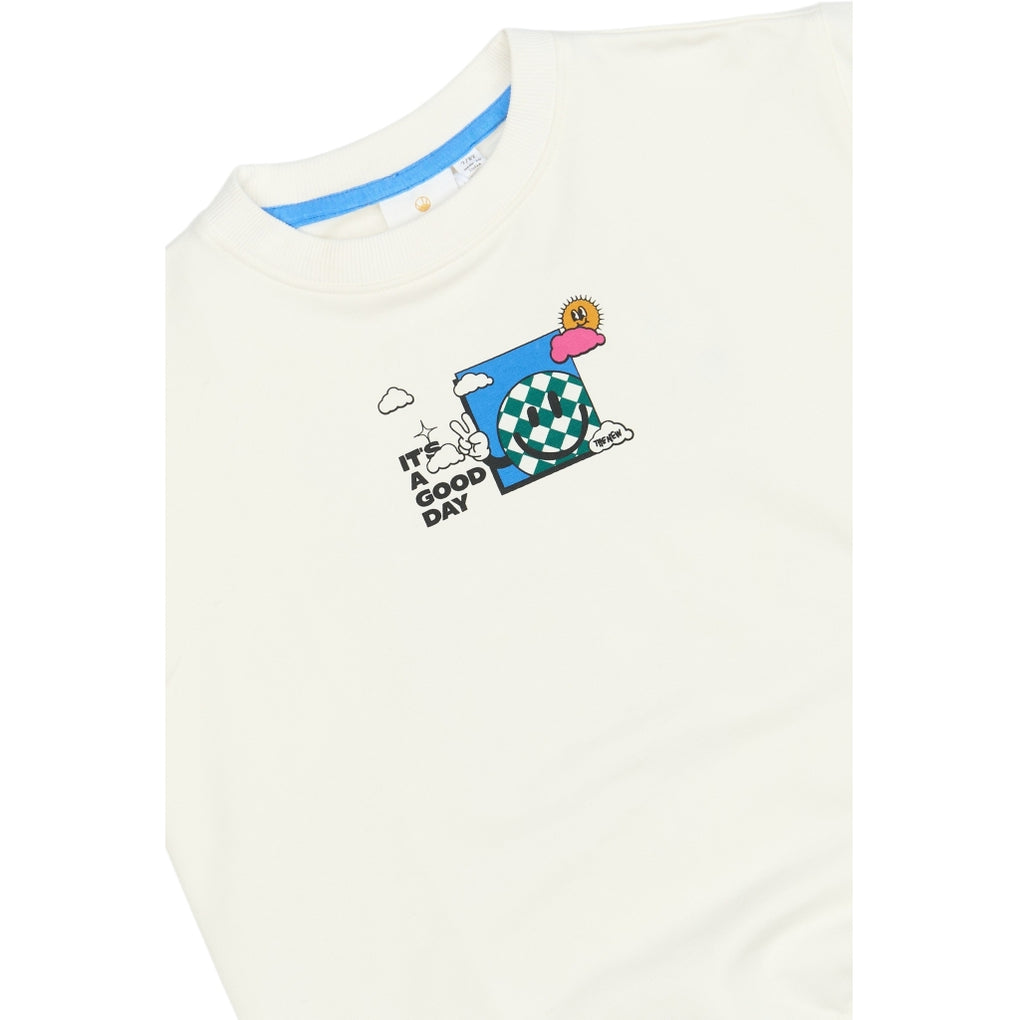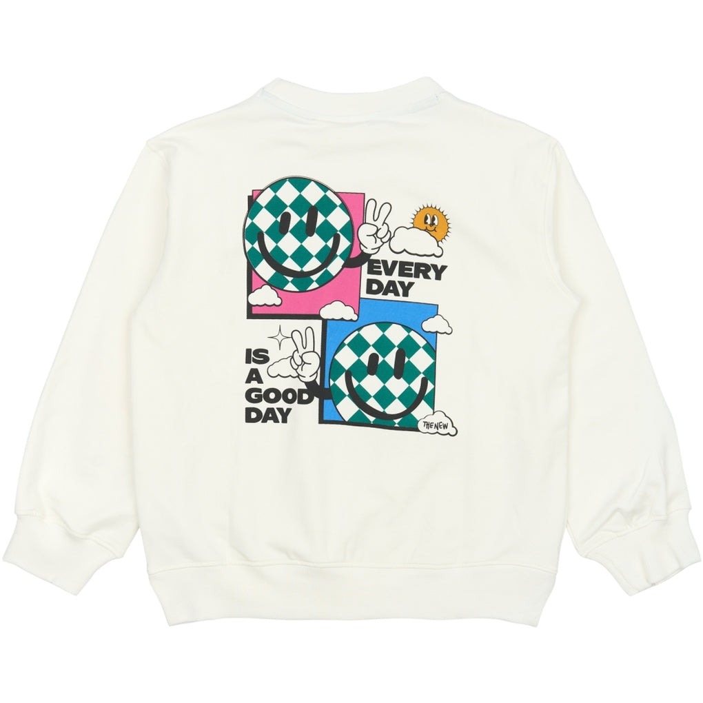 This sweatshirt from THE NEW is both colorful and positive, featuring a unique front print with a smiley face adorned with a checkered pattern, set against a backdrop of sky, sun, and clouds. The text "It's a good day" adds an optimistic touch to the design. On the back of the sweatshirt, you'll find a larger version of the same print, with an additional smiley and the text "every day," reinforcing the joyful and upbeat vibe. A perfect sweatshirt to spread good vibes and create a relaxed yet stylish look.