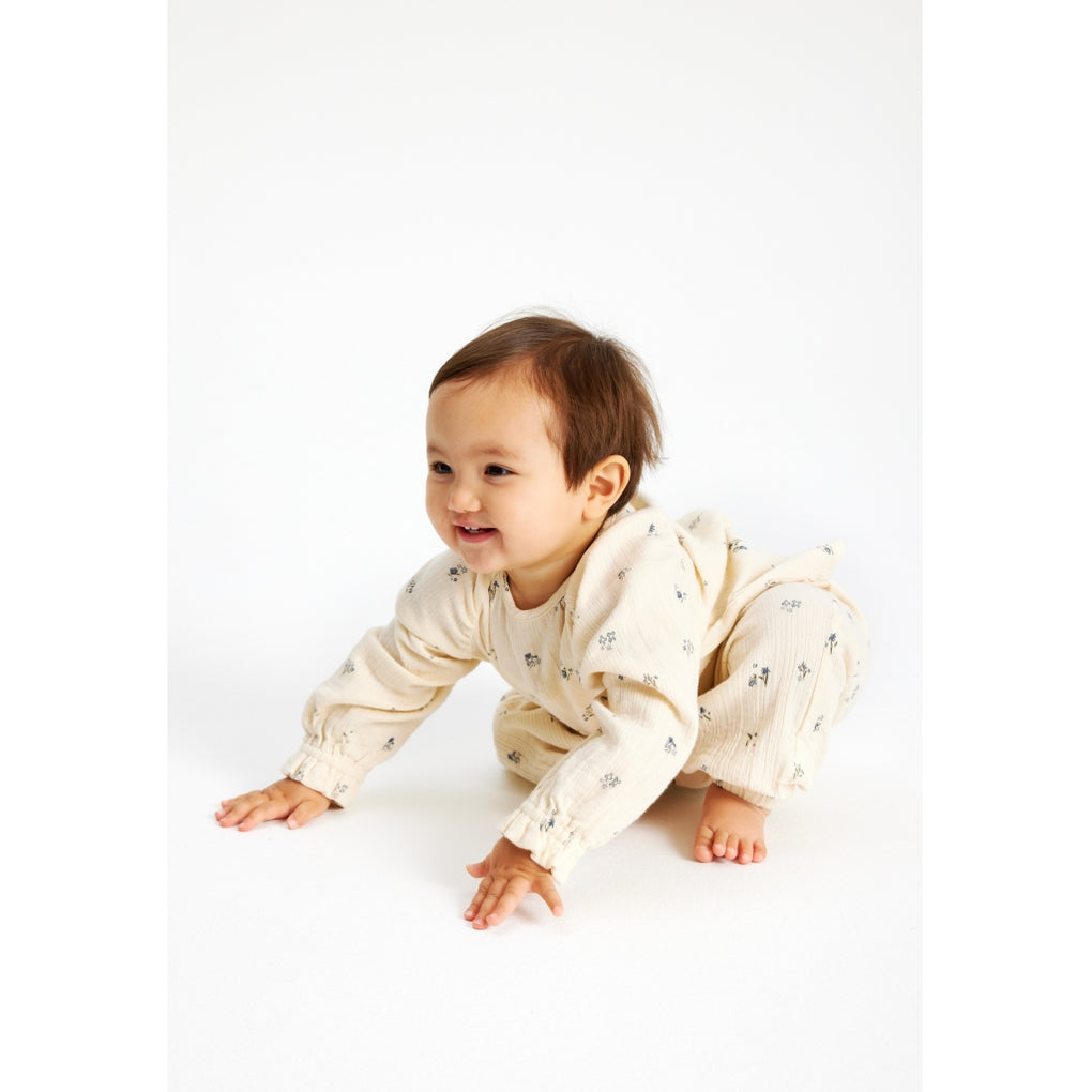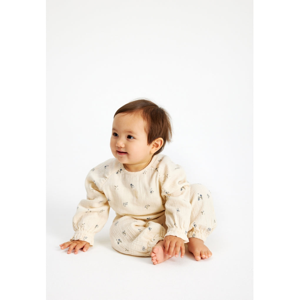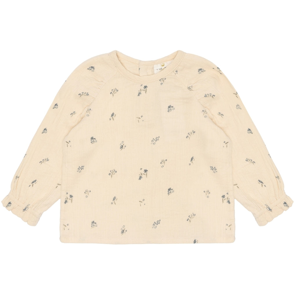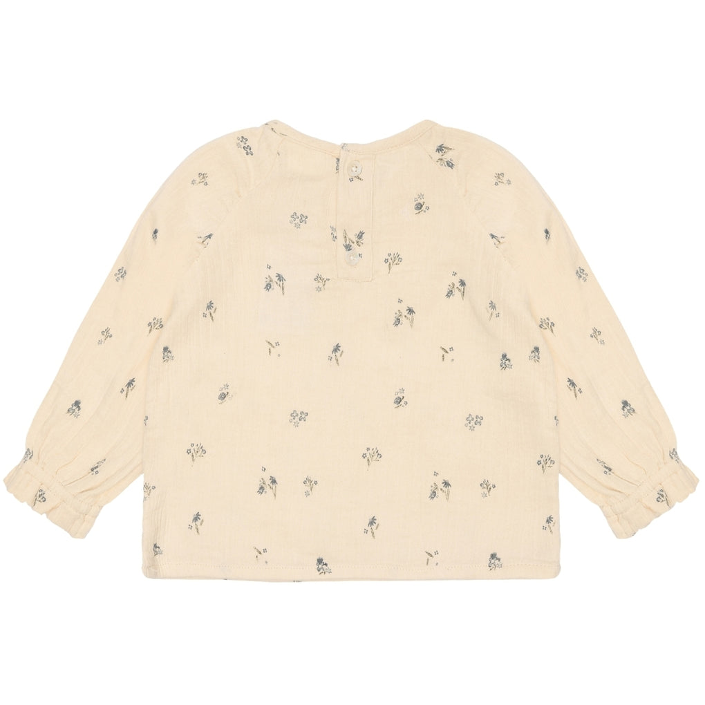 Light beige long-sleeved baby blouse decorated with a pattern of delicate flowers. With a feminine expression, the blouse can be worn both for everyday use and for seasonal festive events, where it can be styled in many different ways.